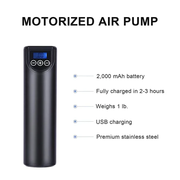 Feature6 : Wireless & Portable: The wireless design and compact mini size make the air compressor portable and easy to operate with one hand. The compressor is ready in only 4 steps. An LCD display indicates the air pressure.Suitable for inflating when the car tires are insufficient and Fully inflated the bicycle and motorcycle tires;