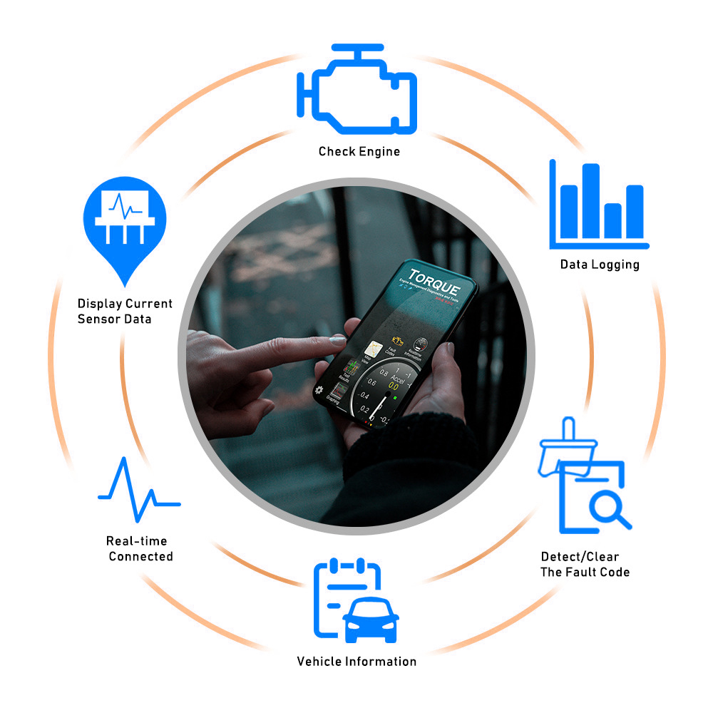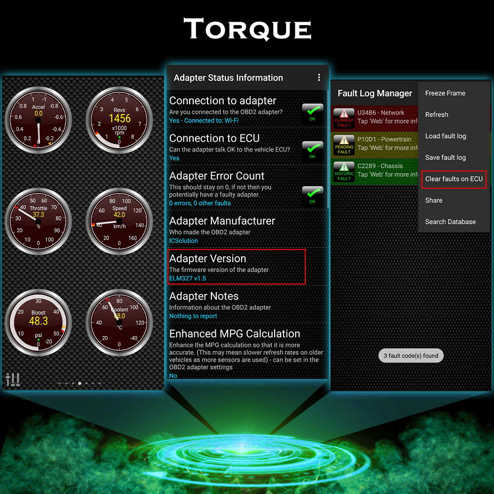 Read diagnostic trouble codes, both generic and manufacturer-specific, and display their meaning (over 3000 generic code definitions in the database).