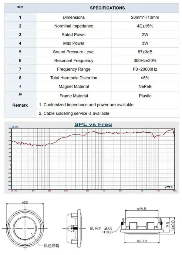 | Color | 28MM 4ohm 3W, 28MM 8ohm 2W |