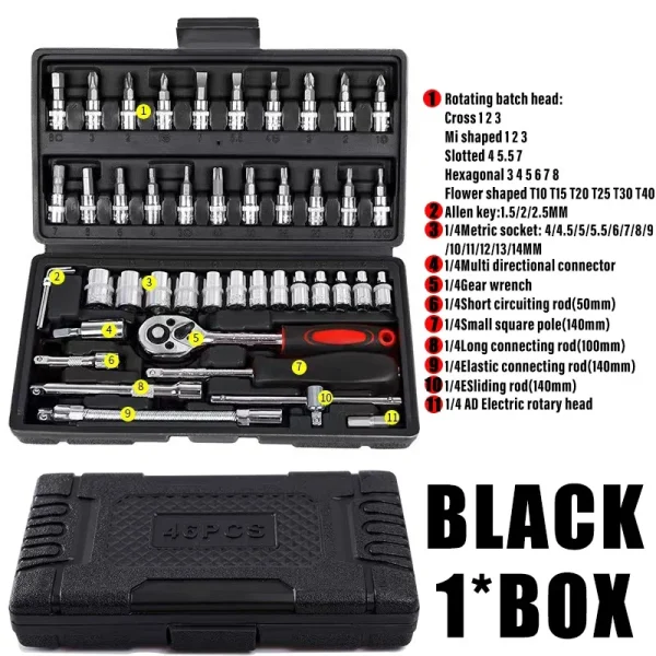 3. Rapid fall off ratchet wrench (positive and negative adjustable), The push button quick release feature ensures taht the socket is locked securely while in use, but also allows for easy removal or quick change of socket evev with greasy or oily finger. and our high quality 45 teeth ratchet can improve the operation speed. Is open throttle, in air conditioning, seat nut, tire fenders, car door locks, home (basic contains) usually used in the suit small screw nut the ideal of a set of tools.