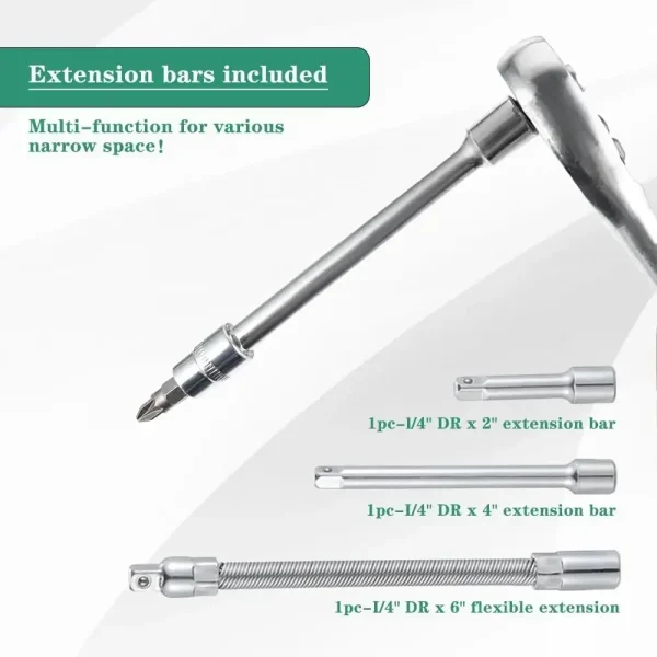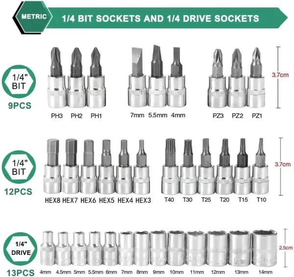 46 ცალი წამყვანი ბუდეების ნაკრები, 1/4 ინჩიანი სახრახნისი გასაღებების ნაკრები ბუდეებით