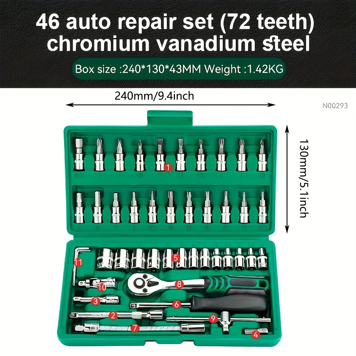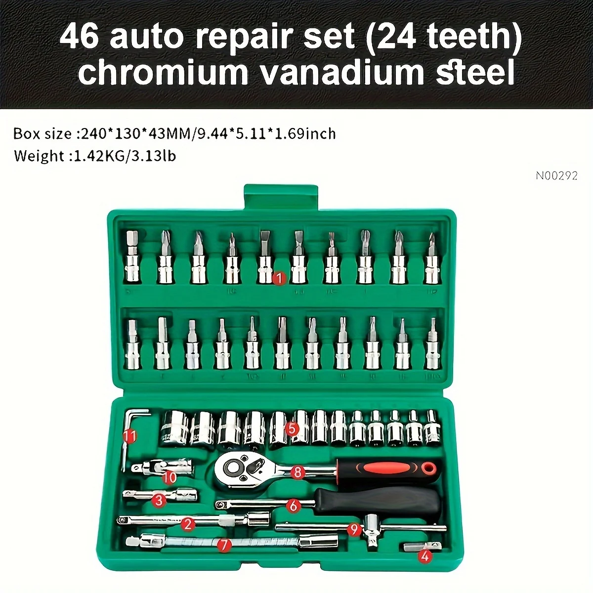 • 46 ცალი 1/4 ინჩიანი წამყვანი ბუდის სახრახნისი გასაღებების ნაკრები, მეტრიკული