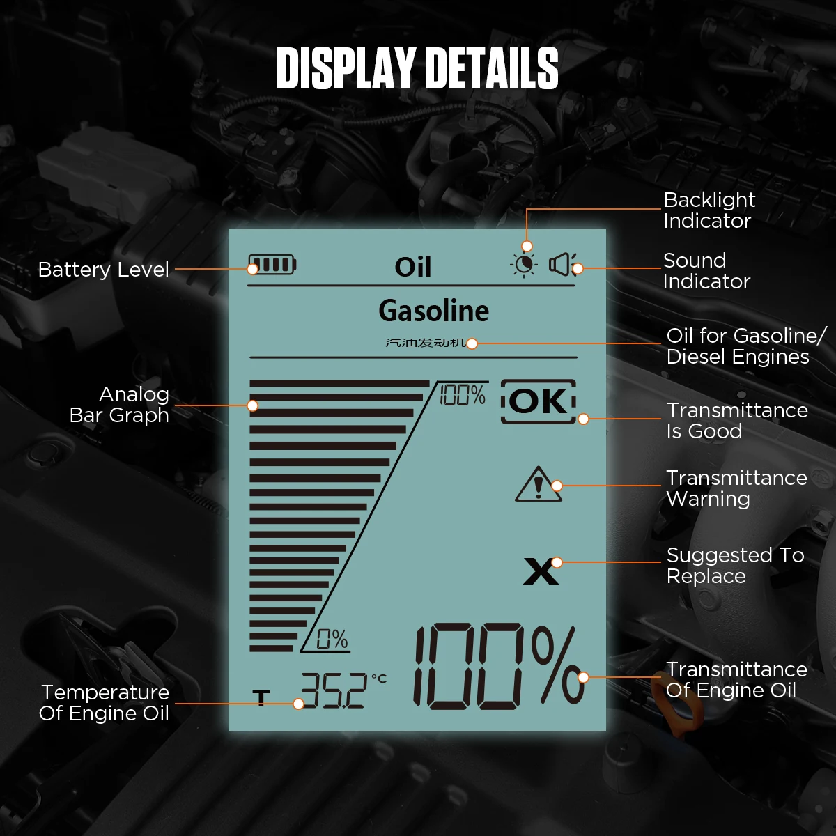 【Sound Alarm】when the transmittance is between 100% and 50%,there is no need to change engin oil.when the transmittance is between 50% and 30%,an exclamation mark will be displayed on the screen to remind you to change the engin oil. when it isbelow 30%.the engin oil tester will emit a “beep”alarm to remind you to change the engin oil immediately to ensure safety.[ T] to indicate the current oil measurement temperature.