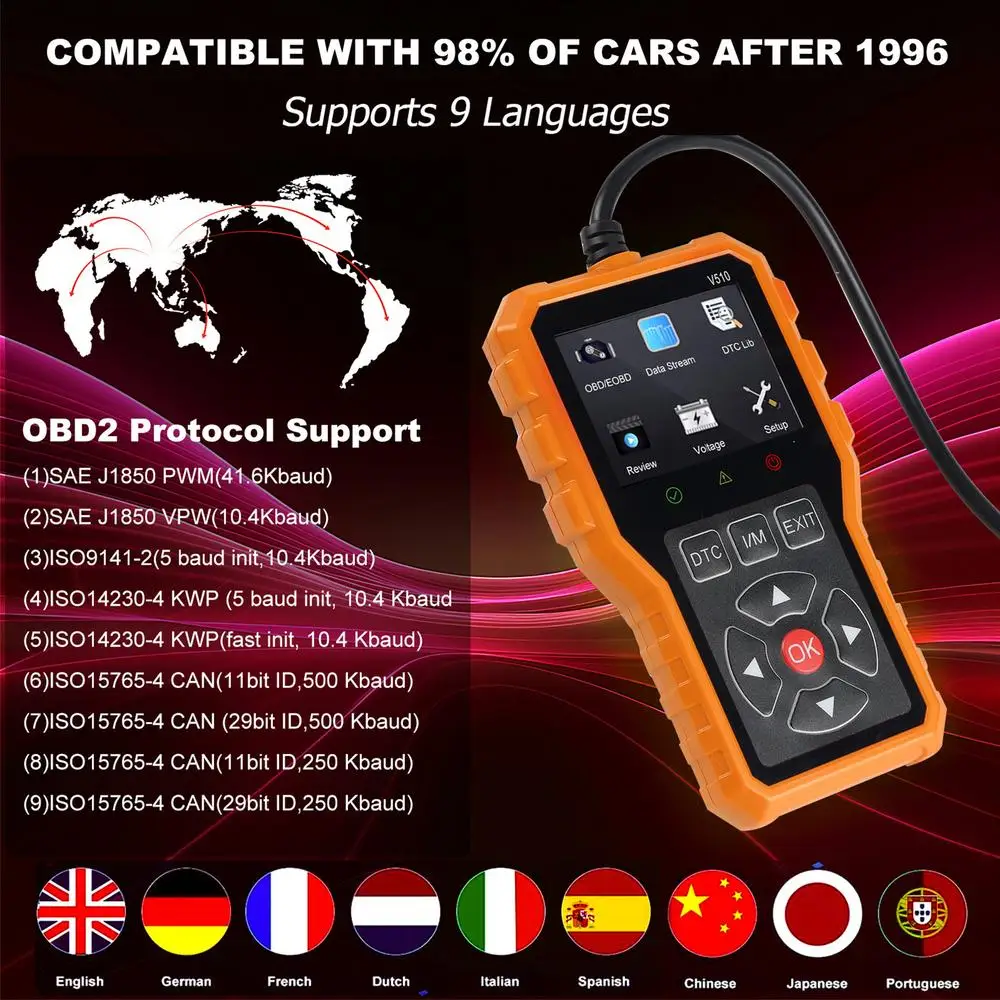 5.Effortless To Use: Unlock key information for various brands, utilize 9 languages effortlessly; simple action with direct fault code explanations and broad compatibility for a seamless diagnostic experience