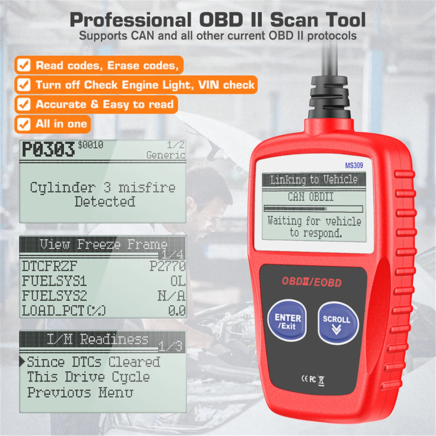 The MaxiScan MS309 CAN OBDII/EOBD code reader provides DIYers easy and quick access to diagnostic trouble codes and their definitions on all OBDII compliant vehicles sold worldwide since 1996. Though small in size, it is powerful enough to retrieve the same information as large expensive scanners. It is the best solution to diagnose all 1996 and newer OBDII compliant vehicles!