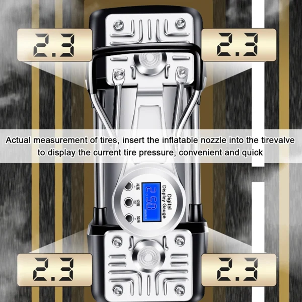 6. Actual measurement of tires, insert the inflatable nozzle into the tirevalve to display the current tire pressure, convenient and quick.
