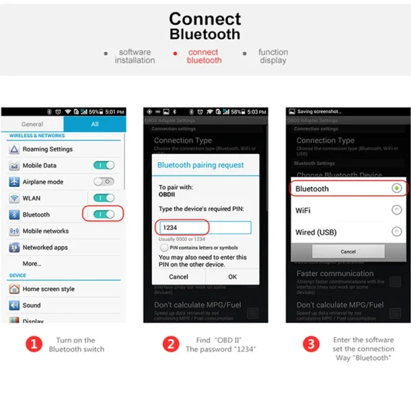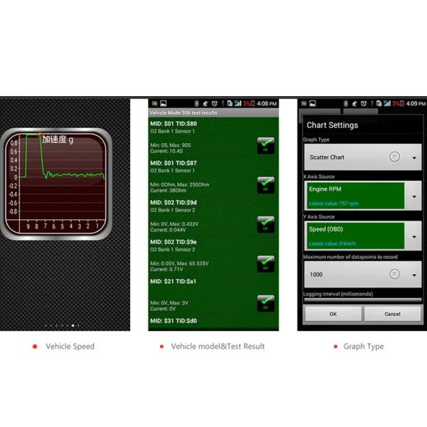Support OBD-II protocols: ISO15765-4 (CAN), ISO14230-4 (KWP2000), ISO9141-2, J1850 VPW, J1850 PWM.