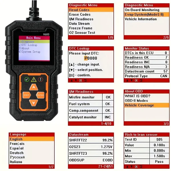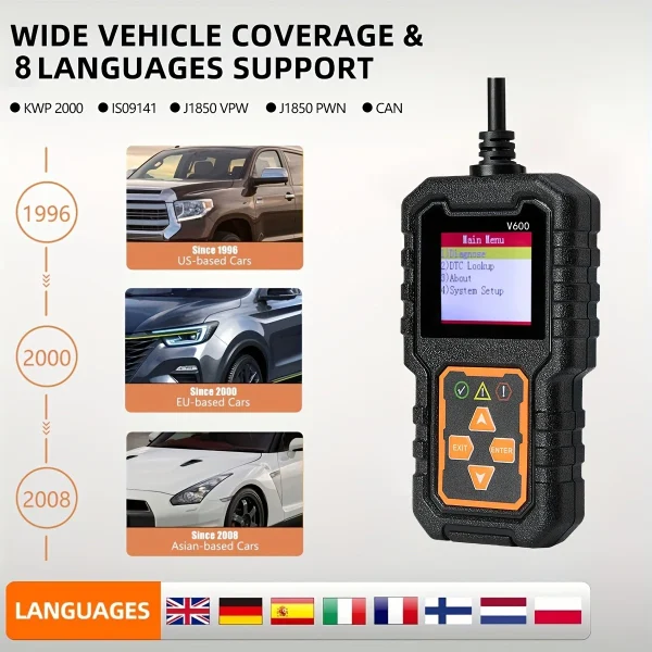 • OBDII სკანერი ავტომობილის დიაგნოსტიკური ინსტრუმენტი, ძრავის გაუმართაობის კოდის წამკითხველი