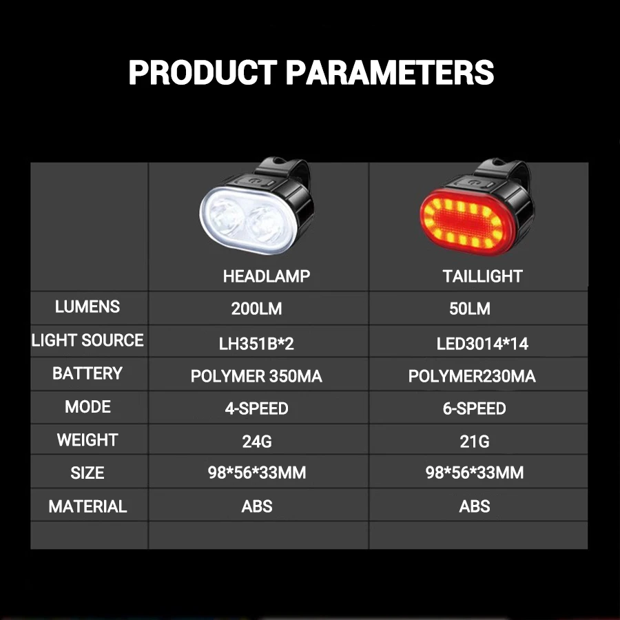 This bike light set includes a headlight and taillight, designed for safe cycling day and night. The headlight features 2 LH351B LED beads with 200 lumens output, offering 3 lighting modes (High/Medium/Low) and a strobe warning mode. The taillight uses 14 LED3014 beads with 50 lumens, providing 6 modes including steady light and multi-strobe effects.