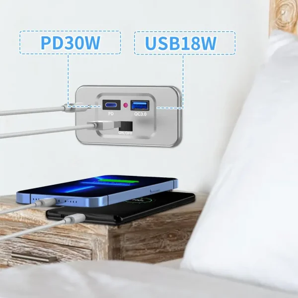 1.Adaptive Performance: Featuring QC3.0 and PD3.0, this RV USB outlet intelligently identifies your device’s needs, providing 3A/2A/1.5A current or 5V/9V/12V voltage automatically.