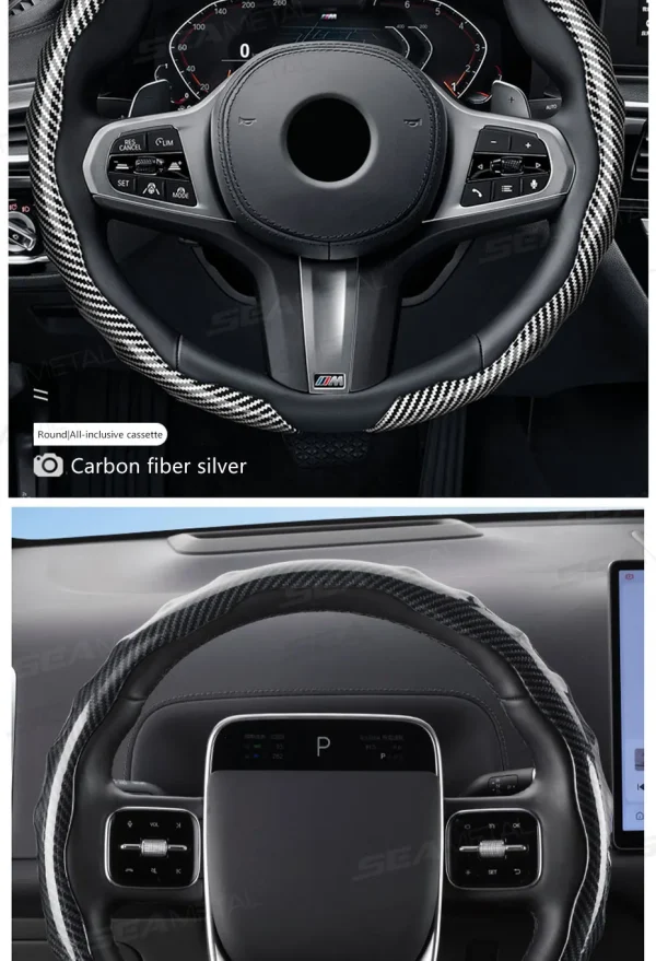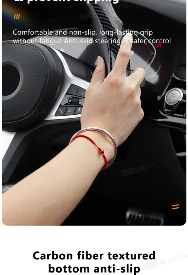 2.Carbon fiber steering wheel cover, non-slip,adds luxury into your car interior Bling under the light.