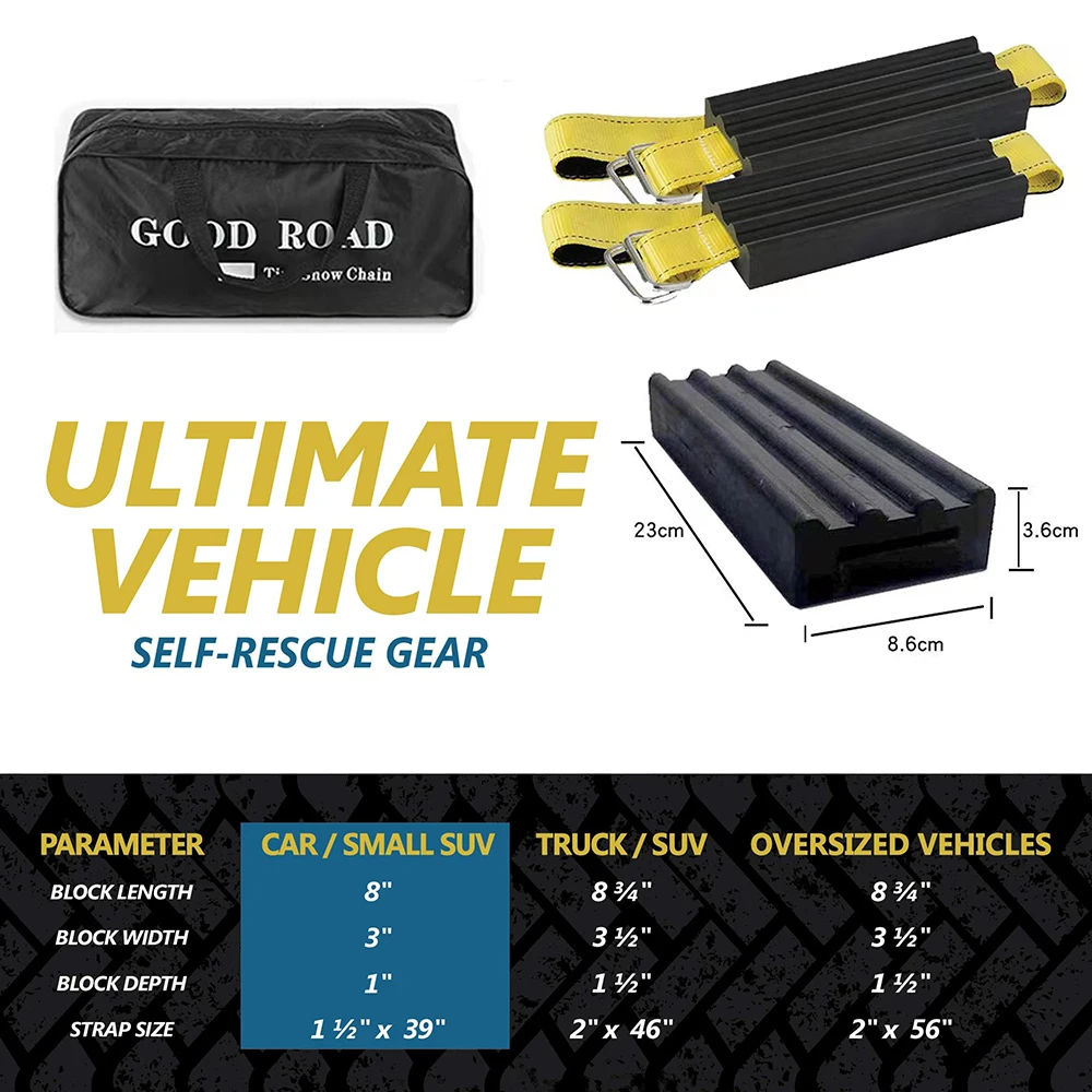 ❄VEHICLE TYPE – the ultimate tire grabber recovery strap recommended for use on your two-wheel drive car, mini van, small SUV, ATV or UTV. Each block measures 8" (L) x 3" (W) x 1" (D). Strap Size 1.5" x 39"
