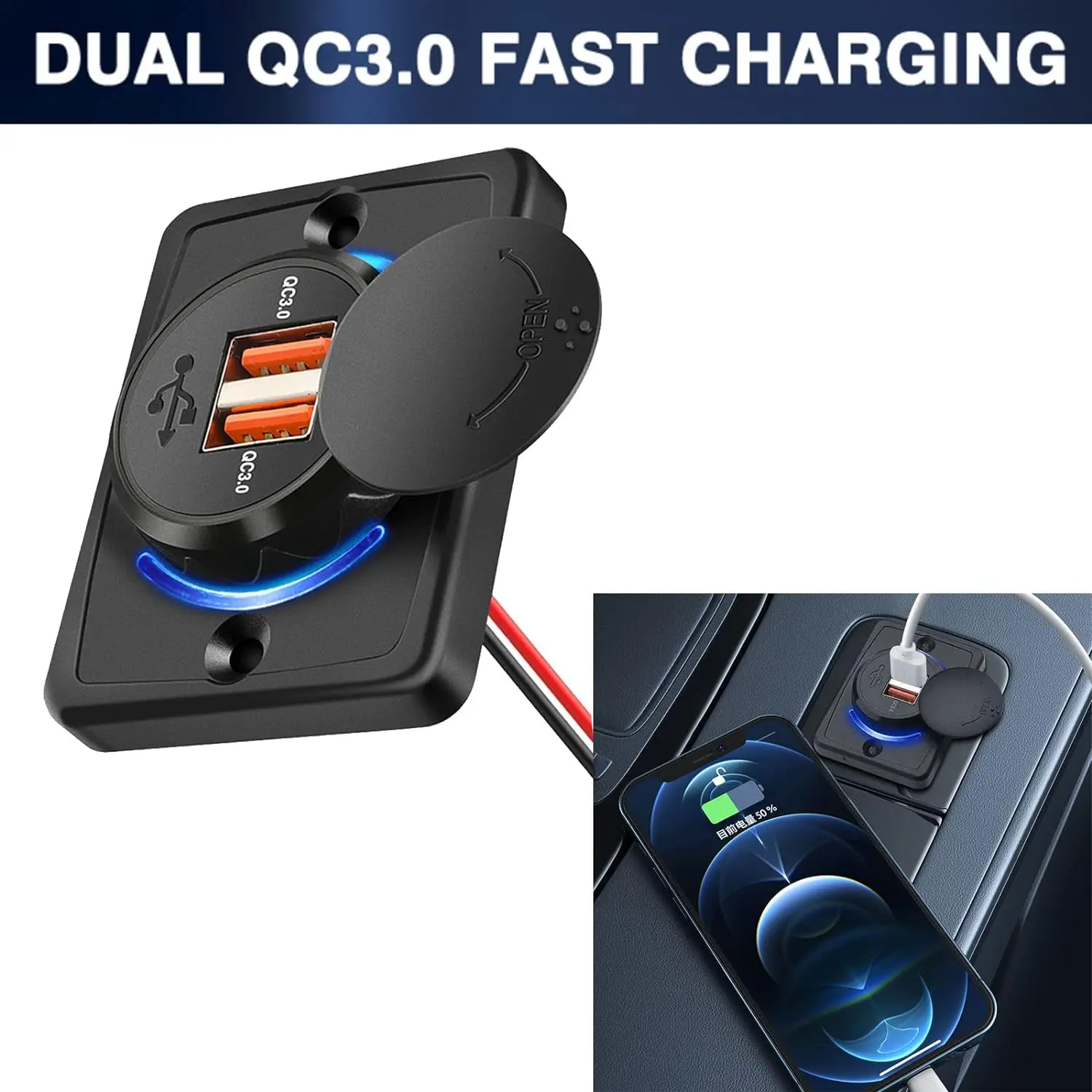 36W Quick Charge 3.0 USB-A Port: Dual USB (18W each port) which is faster than conventional chargers. Suitable for all popular USB devices such as iPhone, iPad, which applies to Cars, Motorcycle, Bus, RV, Boat, etc.